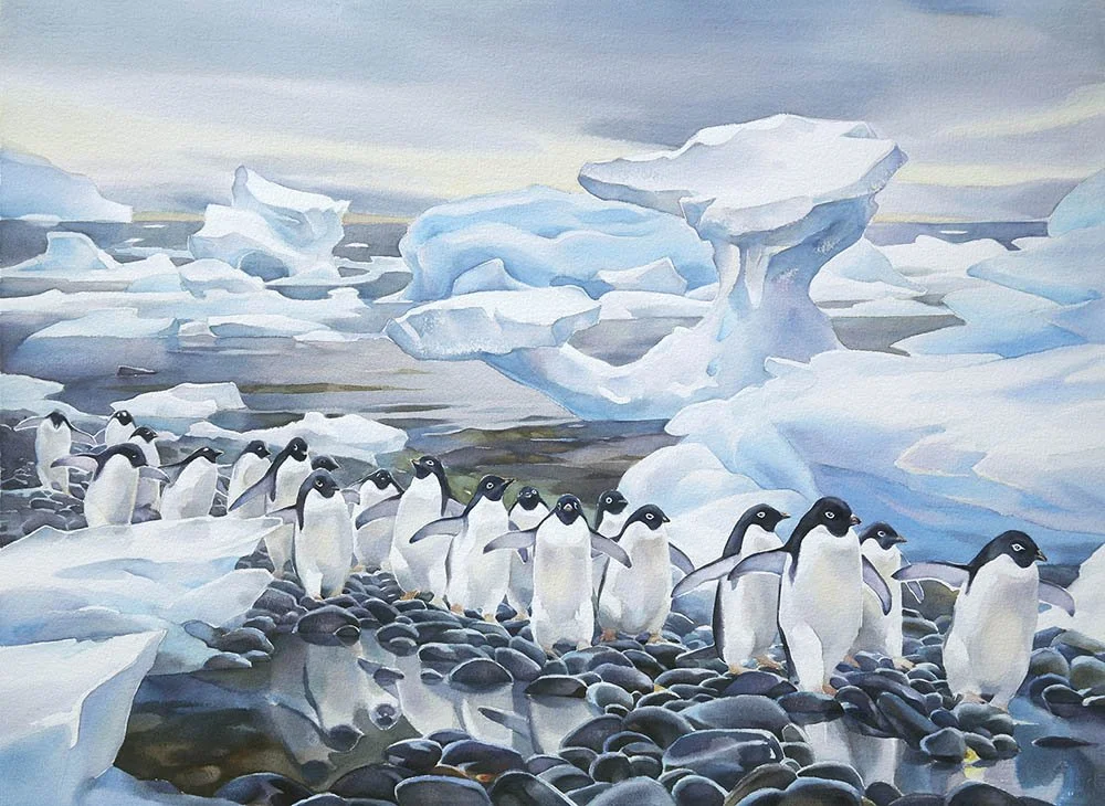 Theme and provided reference material: Exploring the captivating beauty of transparent Antarctic icebergs and the vibrant charm of colourful penguins.